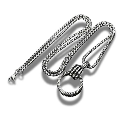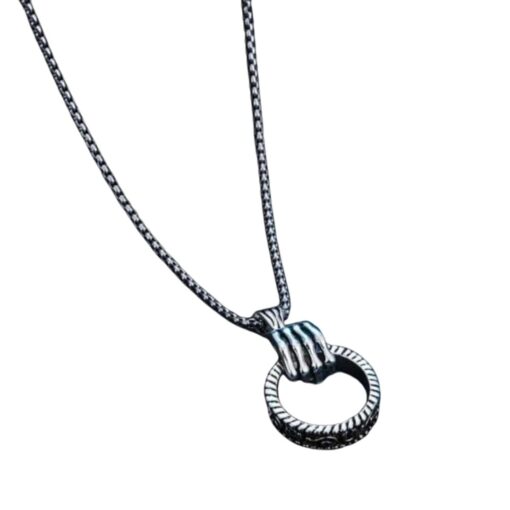 A unique retro-style necklace featuring a bone hand holding a ring pendant. Made from durable alloy, it adds a bold and edgy touch to your look.